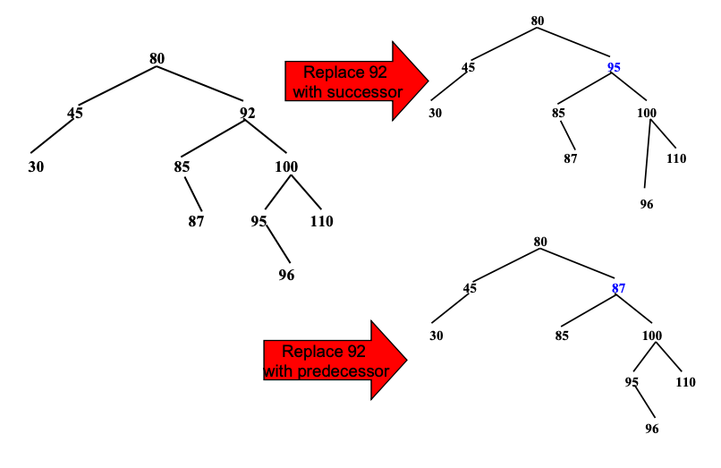 In our sample code we implemented the findMin function to help the deleteNode. The findMin will get the in-order minimum successor, and then use it to replace the deleted node.